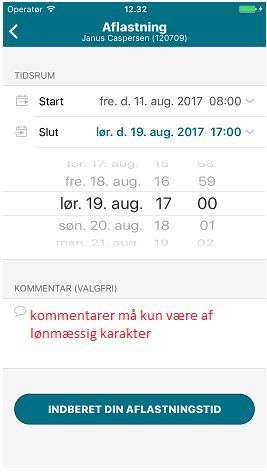 Ønsker du at redigere dato eller tidsrum pga. fejl, beder vi dig slette hele indberetningen og efterfølgende foretage en ny indberetning med korrekt dato og tidspunkt. Trykker du "Rediger" i øverste højre hjørne, bliver du mindet om denne procedure (for redigering af aflastningstid).