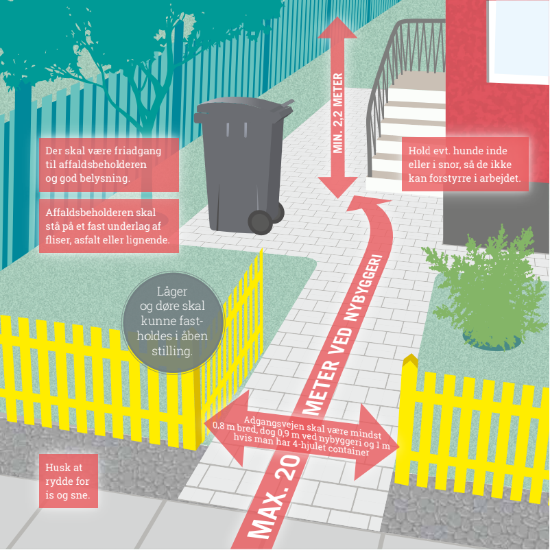 - Adgangsvejen er bred nok til kørsel med en affaldsbeholder eller minicontainer.