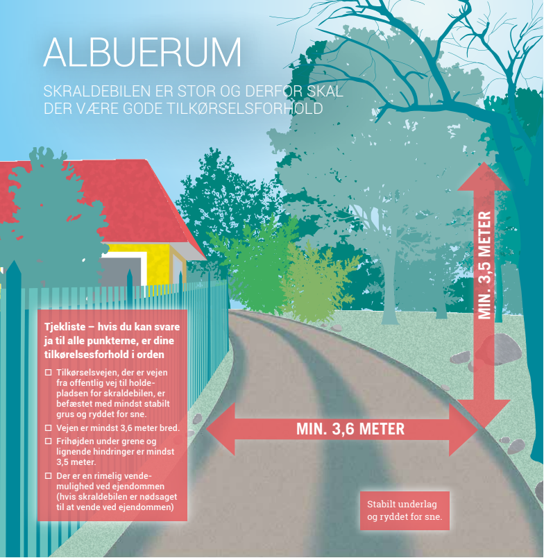 - Adgangsvejen er bred nok til kørsel med en affaldsbeholder eller minicontainer.