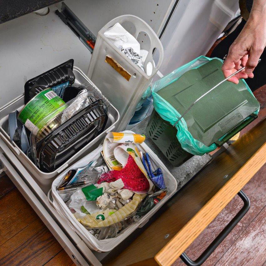 Mitten har lavet sit køkkenskab om til et affaldsarrangement, som næppe vil skuffe (haha).