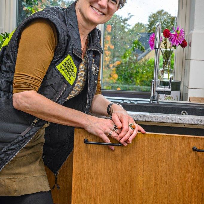 Hun har inviteret os indenfor for at vise, hvordan hun har lavet sit eget køkkenskab om til en praktisk skuffe til affald.