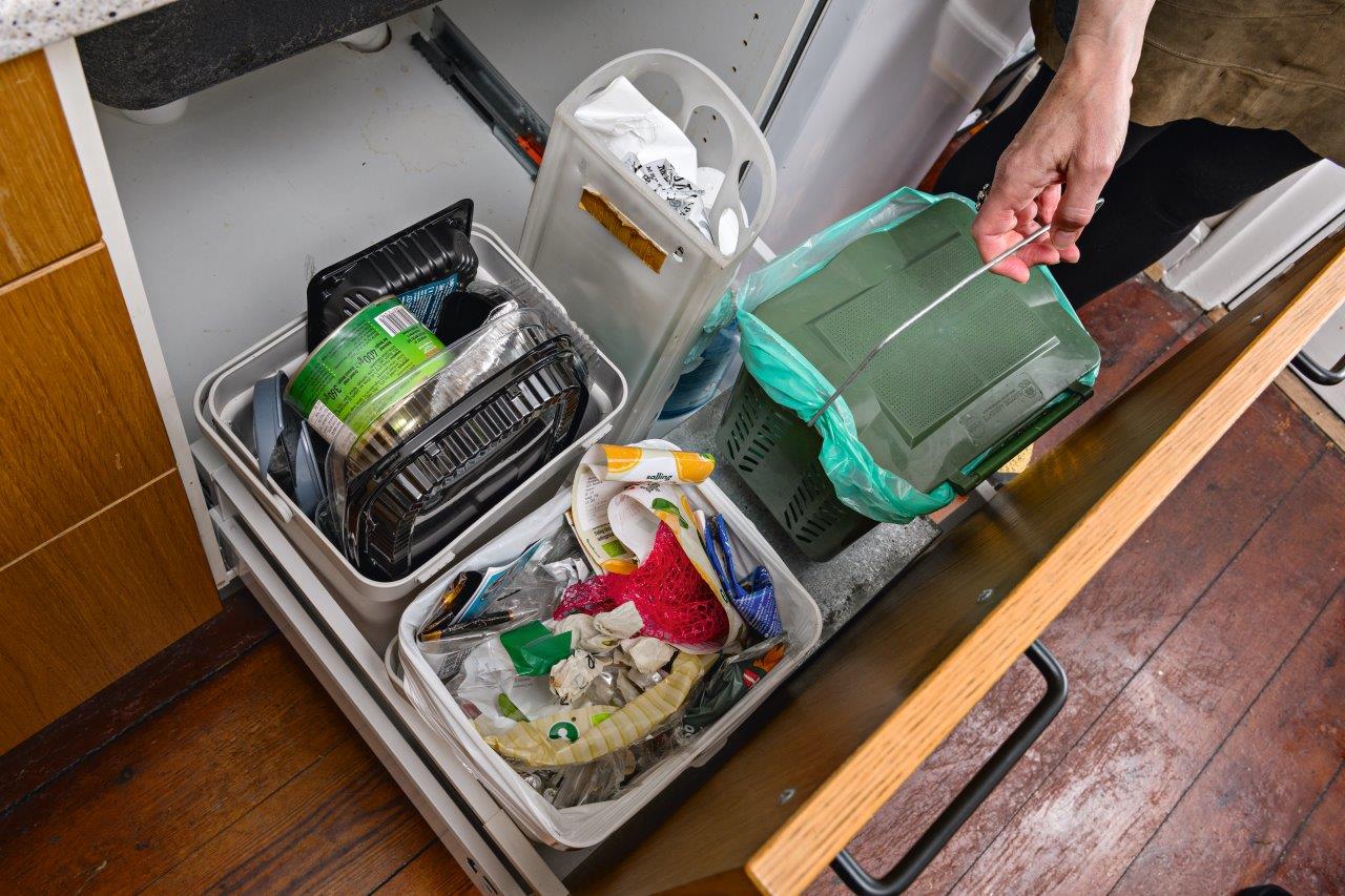 Mitten har lavet sit køkkenskab om til et affaldsarrangement, som næppe vil skuffe (haha).