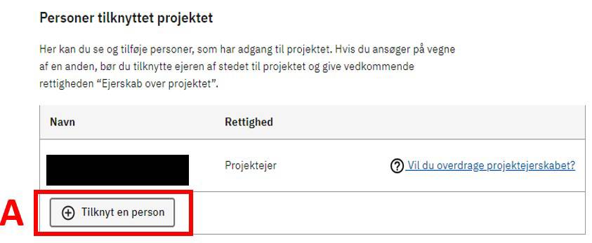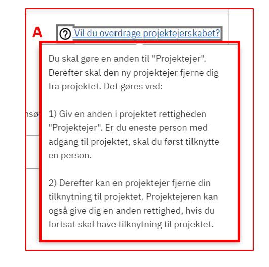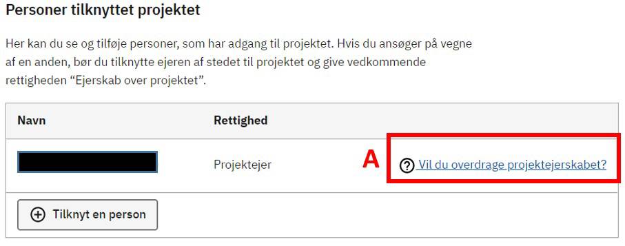 Hvis du skal overdrage projektet til en anden, kan du trykke på Vil du overdrage projektejerskabet? (A)