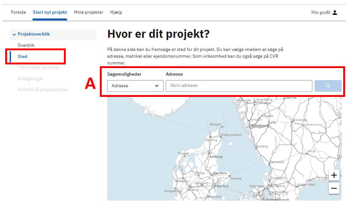 Tryk på Projektoverblik (A). Du vil nu kunne se en liste over de overordnede temaer, du skal igennem for at kunne indsende en byggeansøgning. Det er Sted, Tilknyttede personer, Ansøgninger og Forhold på stedet.