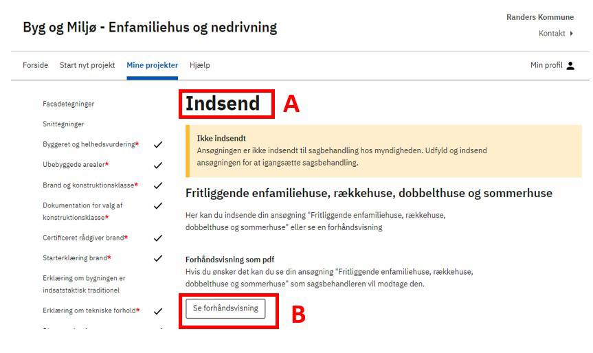 Tryk Forhåndsvisning (B) hvis du vil se ansøgningen inden den endelig indsendelse.