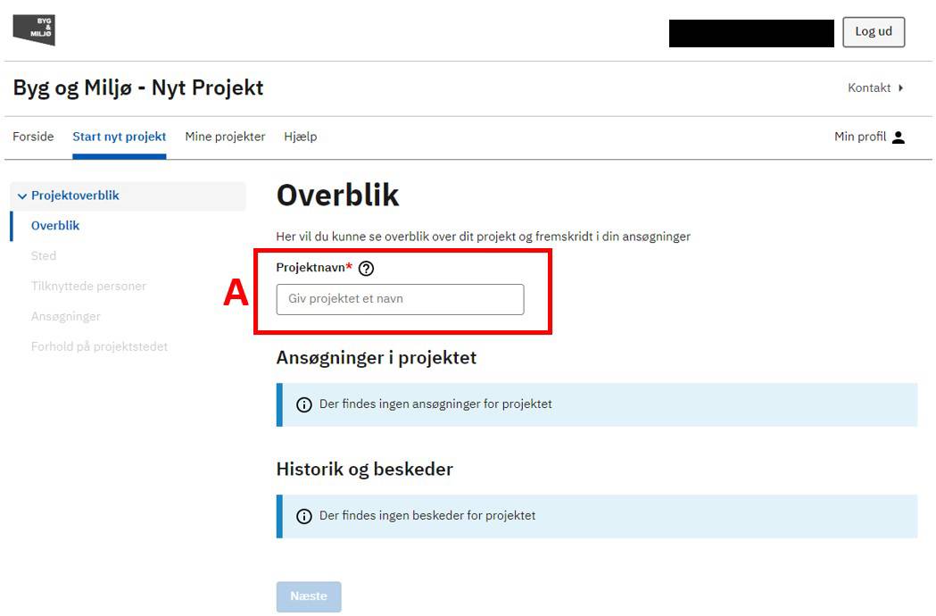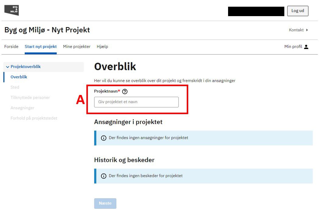Start med at angive et Projektnavn (A), du kan huske. Navnet er op til dig.