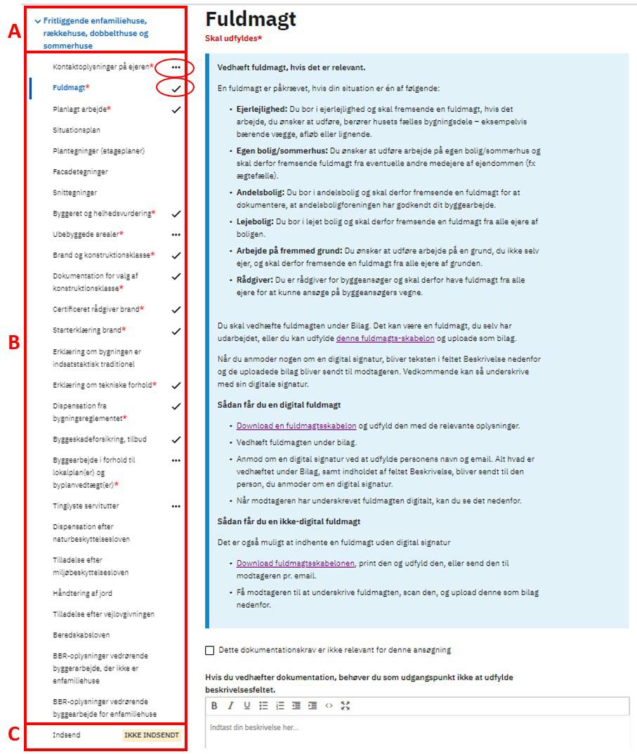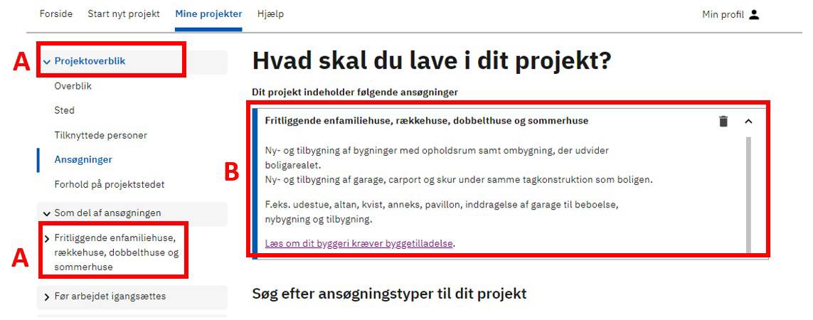 Under ansøgningstypen Fritliggende enfamiliehuse, rækkehuse, dobbelthuse og sommerhuse (A) vises de dokumentationskrav (B), du skal igennem ved ansøgning om et enfamiliehuse.