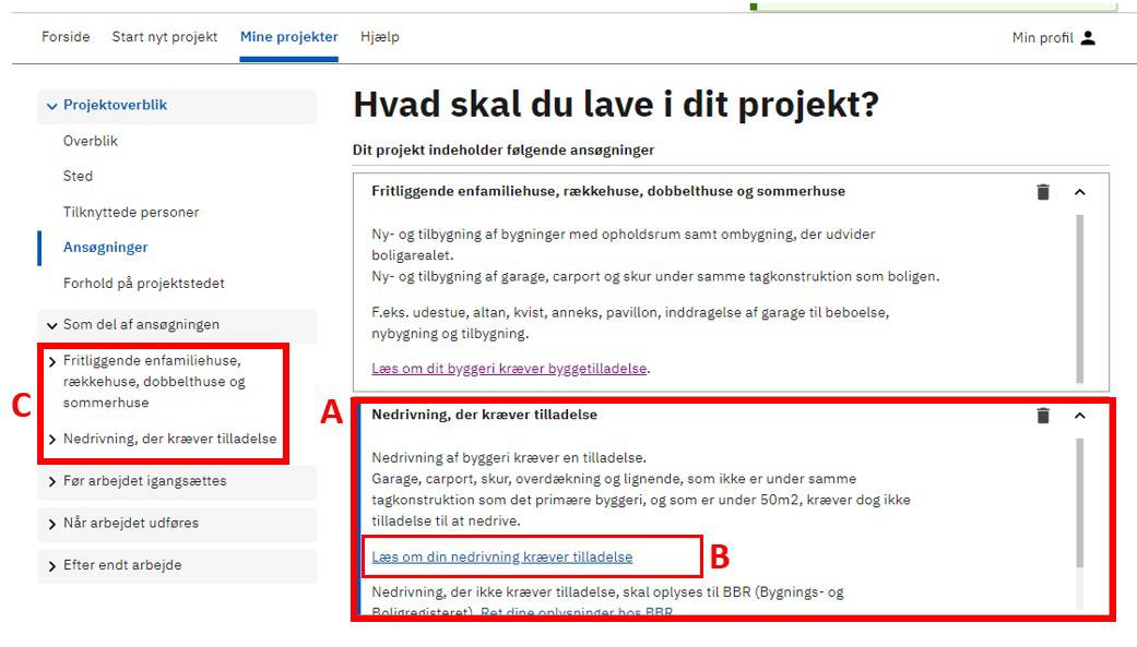 Anneks og nedrivning vil nu være samlet i det samme projekt (C).