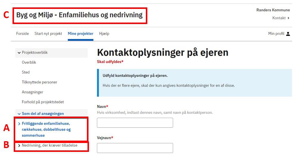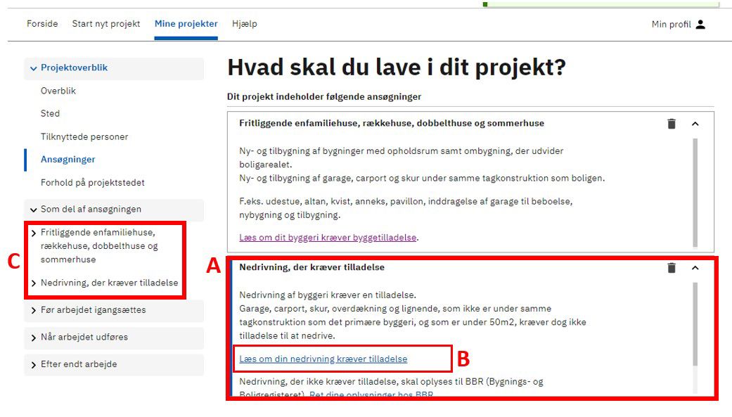 I dette eksempel er der valgt to ansøgningstyper. En vedrørende enfamiliehus (A) og en anden vedrørende nedrivning (B). Begge ansøgningstyper er samlet i det projekt, vi startede med at kalde Enfamiliehus og nedrivning (C) i Overblik (se punkt 3).