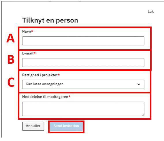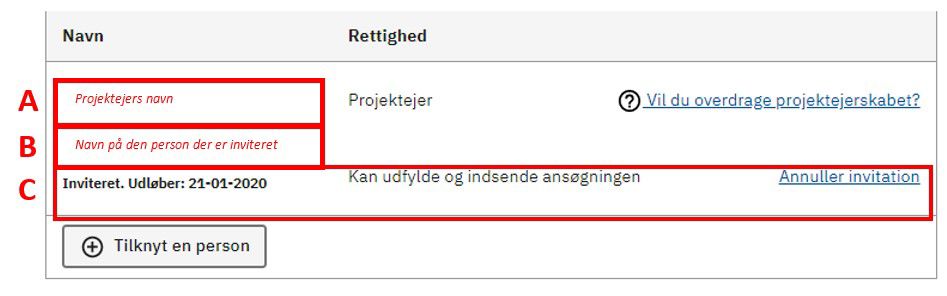 Når invitationen er sendt, kan du se projektejerens navn (A), navn på den person du har inviteret (B) og (C) kvittering på, at invitationen er sendt.