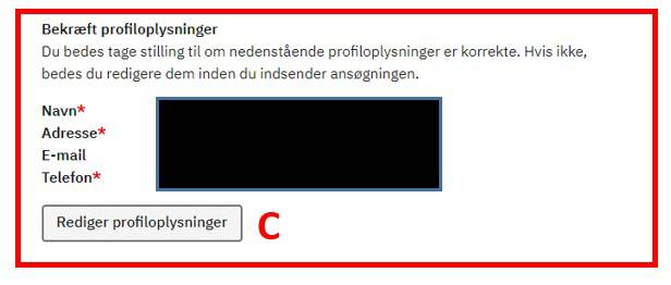 Tjek om dine profiloplysninger er korrekte, ellers Rediger profiloplysninger (C).