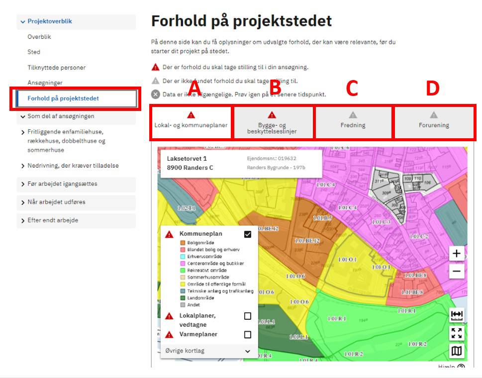 Her vil du få oplysninger om forhold, der kan være relevante at få undersøgt, inden du sender din ansøgning. Der er fire faner, du kan klikke dig igennem Lokal- og kommuneplaner (A), Bygge- og beskyttelseslinjer (B), Fredning (C) og (D) Forurening.