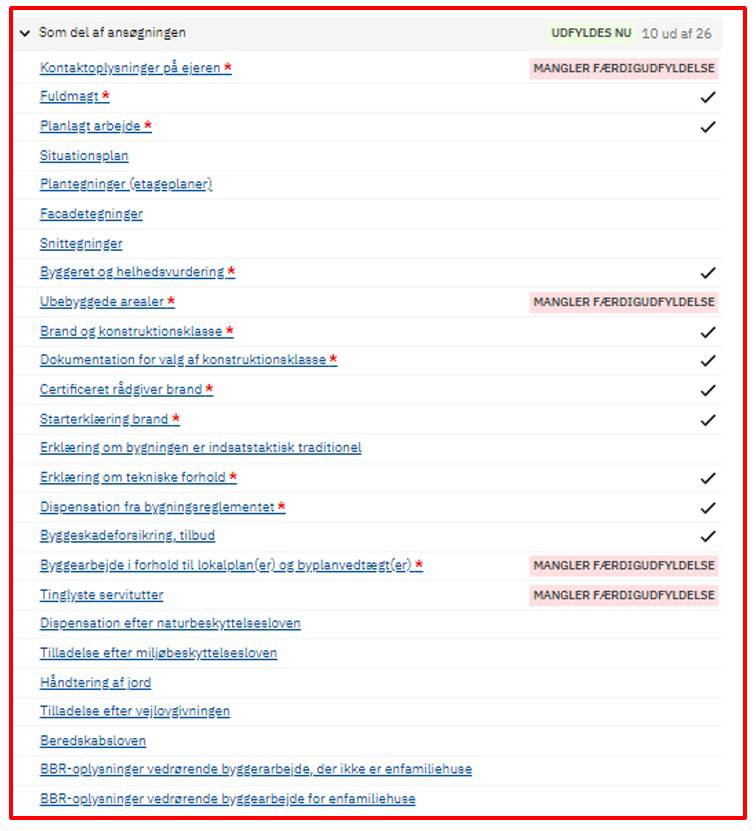 Tryk på det dokumentationskrav du skal udfylde, og du vil komme tilbage til feltet, hvor det er muligt at udfylde, skrive eller vedhæfte bilag.