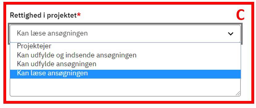 Tryk på pilen til højre i feltet Rettighed i projektet (C). En liste af valgmuligheder åbner, og du skal vælge den rettighed, som personen skal have til projektet.