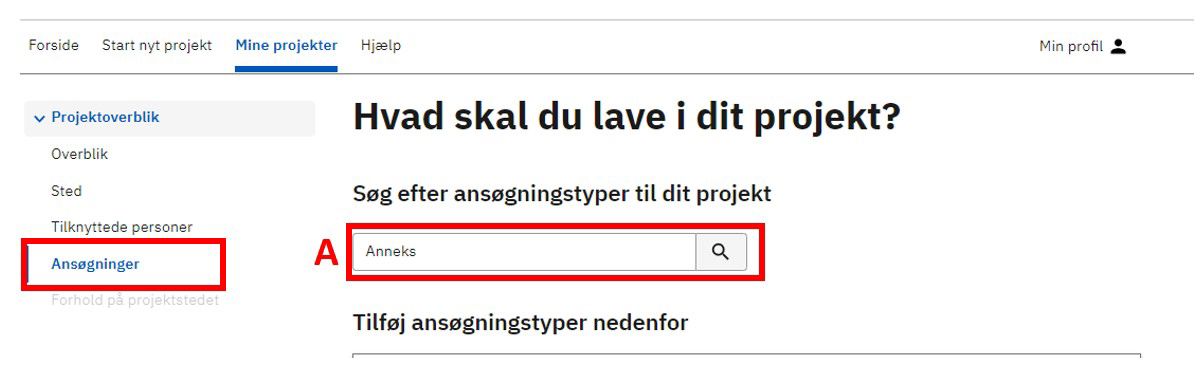 Find den ansøgningstype, der passer til det byggearbejde, du skal i gang med. Hvis du ikke kan finde ansøgningstypen, kan du bruge søgefeltet. Hvis du eksempelvis skal opføre et ”Anneks”, kan du skrive det i søgefeltet (A).