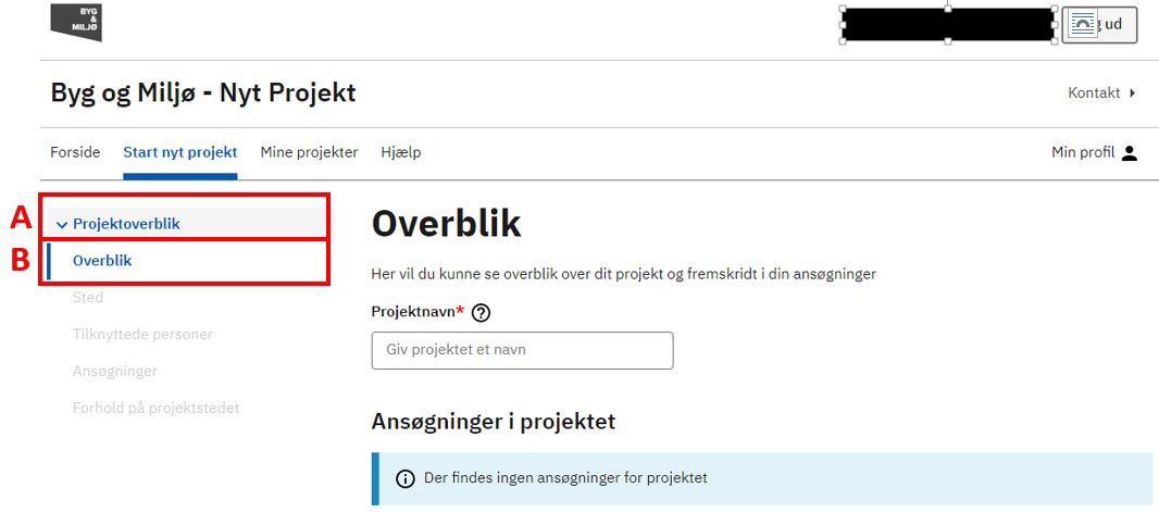Det er også under Projektoverblik, du kan orientere dig om, hvor du er i udfyldelse af ansøgningen. Det markeres med en lodret blå streg til venstre for temaet (B). Du skal nu trykke på Overblik (B).