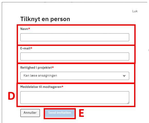 Når alle felter er udfyldt, trykker du Send invitation (E).