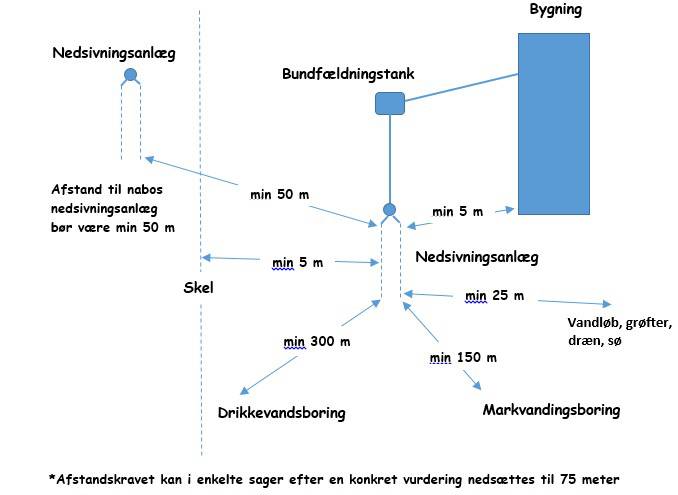 Hvis du ønsker at etablere et nedsivningsanlæg, skal din kloakmester søge om tilladelse igennem vores selvbetjeningsløsning. Når der søges om etablering af nedsivningsanlæg, skal der angives placering af det ønskede anlæg, dimensionerne af anlægget, og om afstandskravene er overholdt. Til ansøgningen skal der vedhæftes en sigteanalyse af det jord/sand, hvori spildevandet skal nedsives, samt en kloaktegning med placering af bundfældningstanken og nedsivningsanlægget.