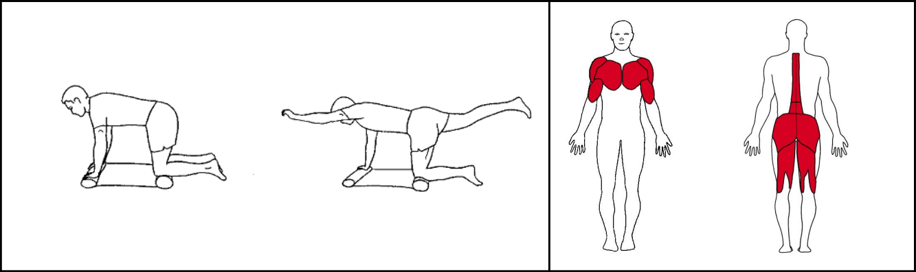 Placerer dine knæ på en måtte eller et håndklæde. Stå på alle fire således at armene og knæene er placeret på måtten/håndklædet. Spænd op i maven og ryggen og løft og stræk skiftevis modsat arm og ben. Man kan evt. rulle måtten/håndklædet sammen så øvelsen bliver mere udfordrende.