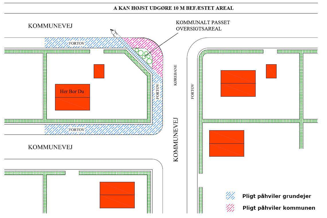 Ved en hjørnegrund, hvor der er et oversigtsareal, har grundejeren pligt til vintertjeneste på alle tre sider, men kun indenom oversigtsarealet, da den del af fortovet ligger tættest på grunden.