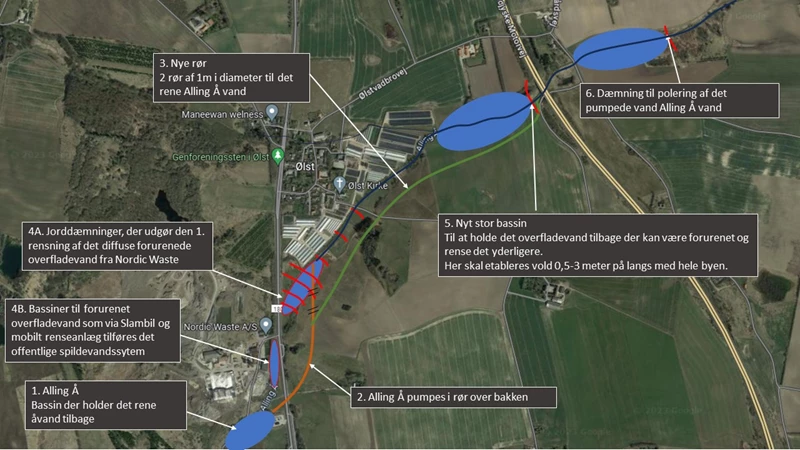 - For enden af å-vandsbassinet har vi placeret en række pumper, der med en kapacitet på op til 6000 liter/sekund pumper det rene å-vand i rør op over bakken og forbi skadeskedet for så at møde åen igen nord for skadestedet. (se den orange linje på tegning nedenfor).