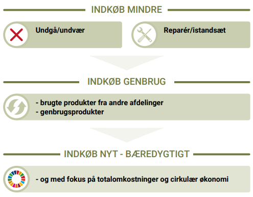 • Indkøbe bæredygtigt og med fokus på produkters/ydelsers totalomkostninger og på cirkulær økonomi, hvor vi i indkøbet også forholder os til afledte driftsomkostninger og mulighederne for efterfølgende genbrug og genanvendelse af produkter.