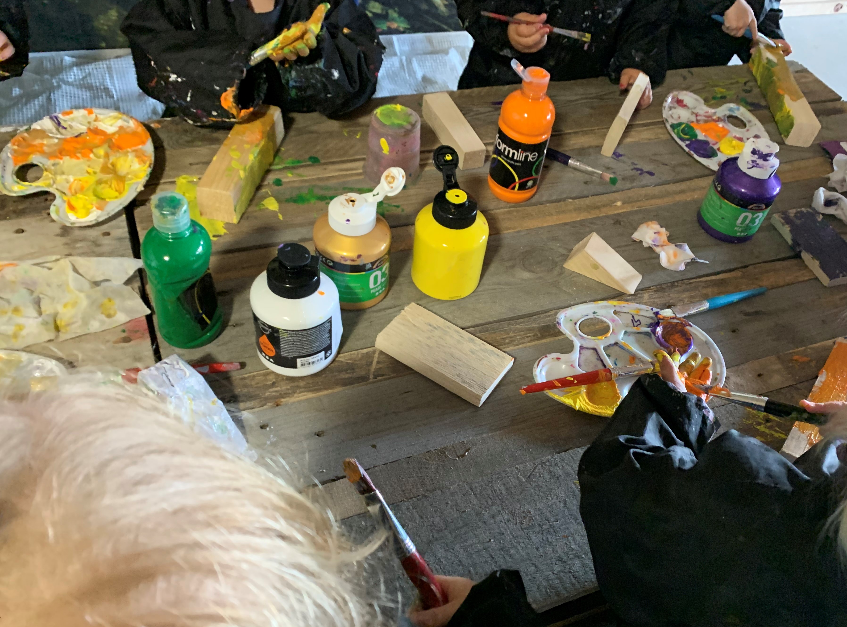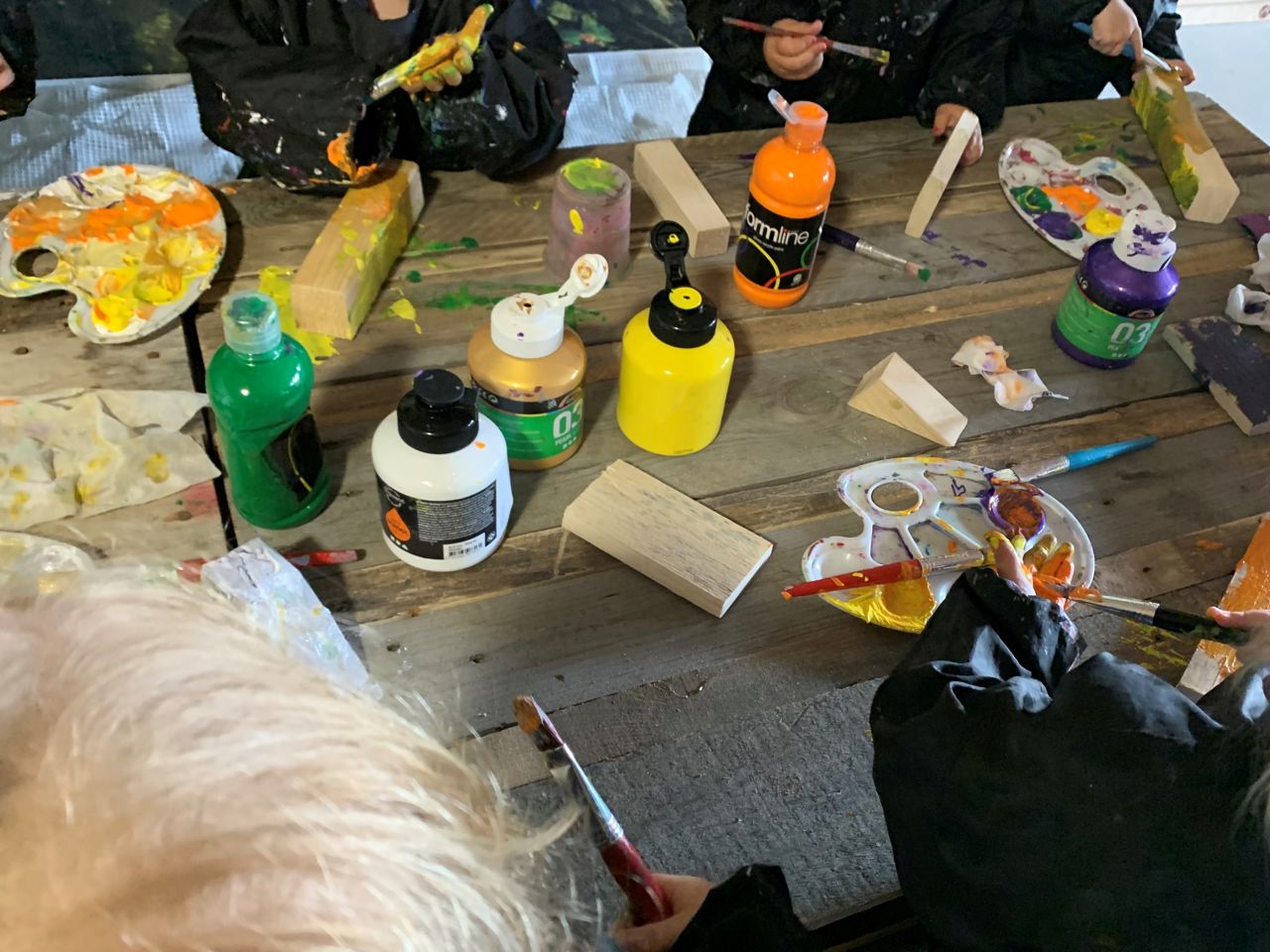 Otte børn og en lille håndfuld voksne fra Kristrup Vuggestue var onsdag den 31. maj på besøg hos Møbelcirklen på Toldbodgade 81. Her blev der malet træklodser til den helt store guldmedalje. Træklodser, som nu skal sættes sammen til uroer og hænges op og pynte i træerne på Kristrup Vuggestues legeplads.