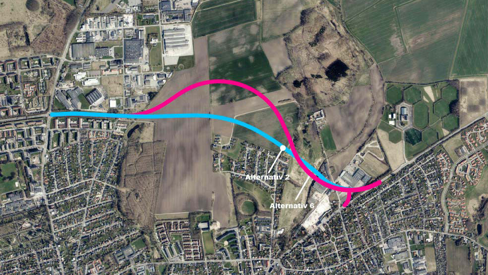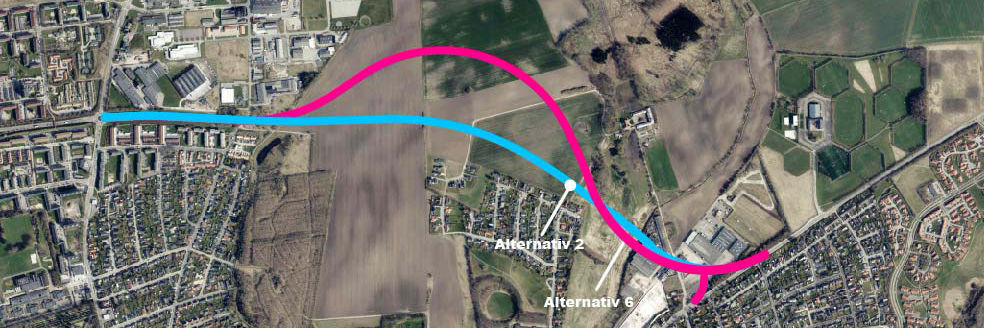 Siden har en række alternative forslag til placeringer af vejen været i spil, og på den baggrund besluttede byrådet sidste forår at sende to alternative forslag til linjeføringer tættere på eksisterende boligområder i fordebat – nemlig alternativ 2, der nu er valgt, og alternativ 6.