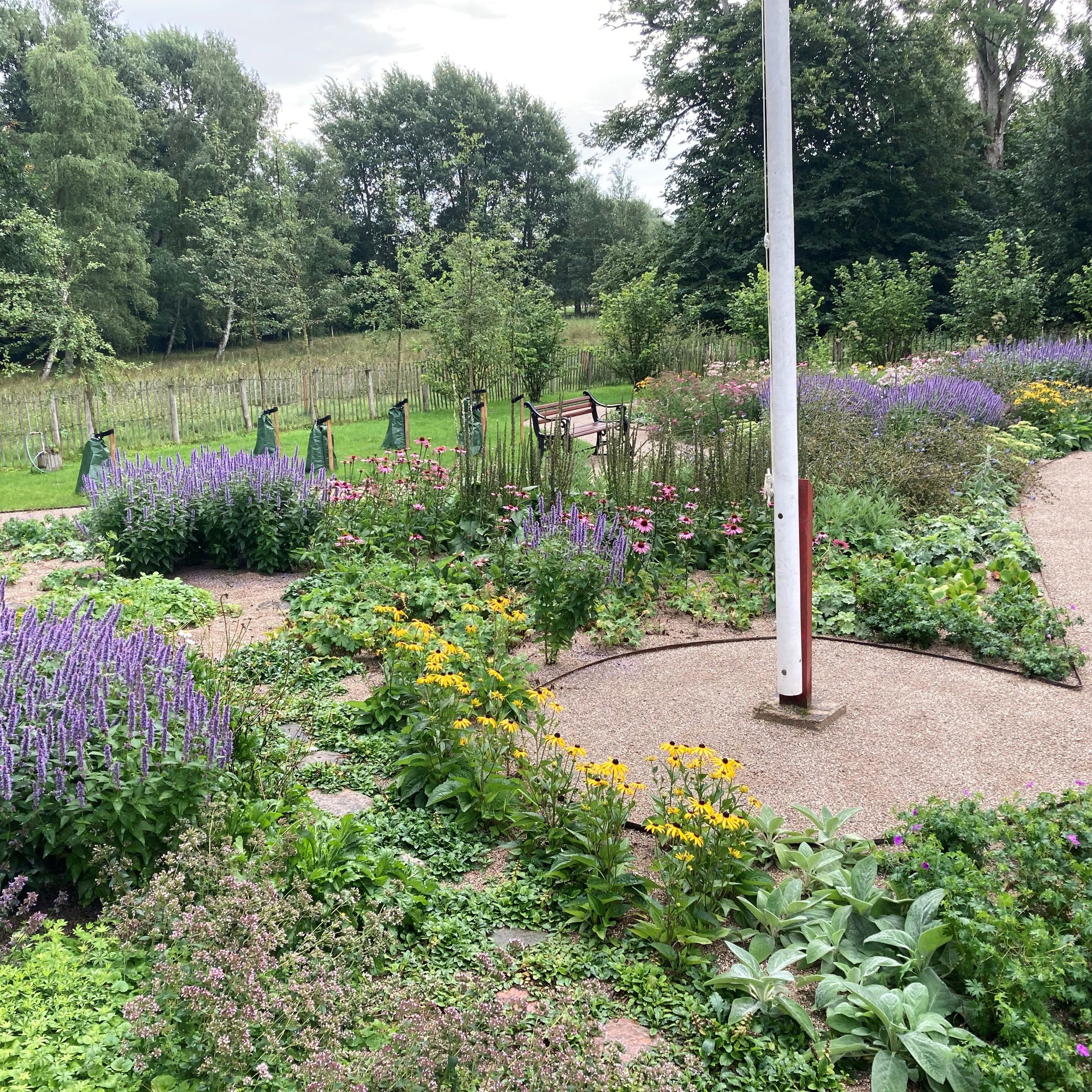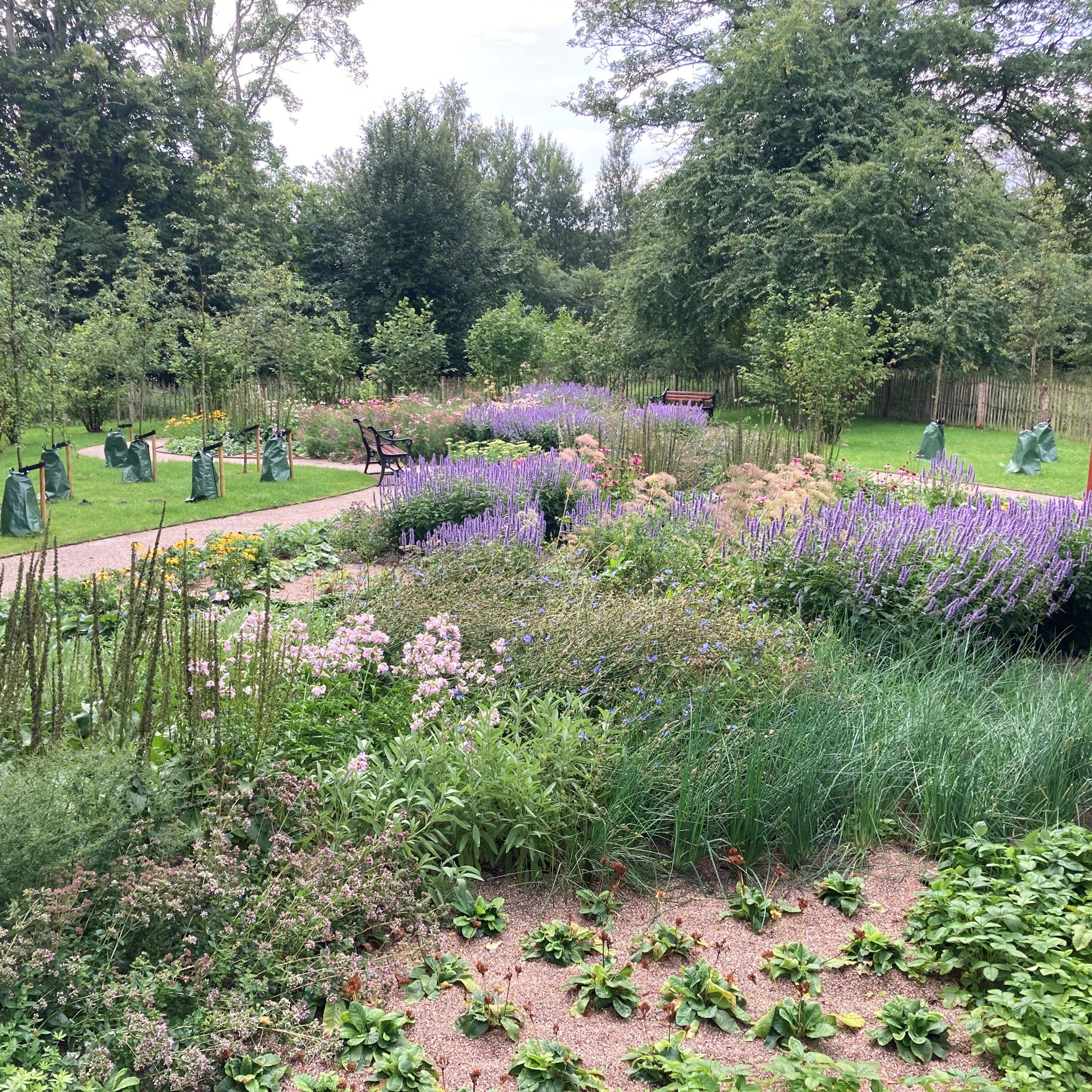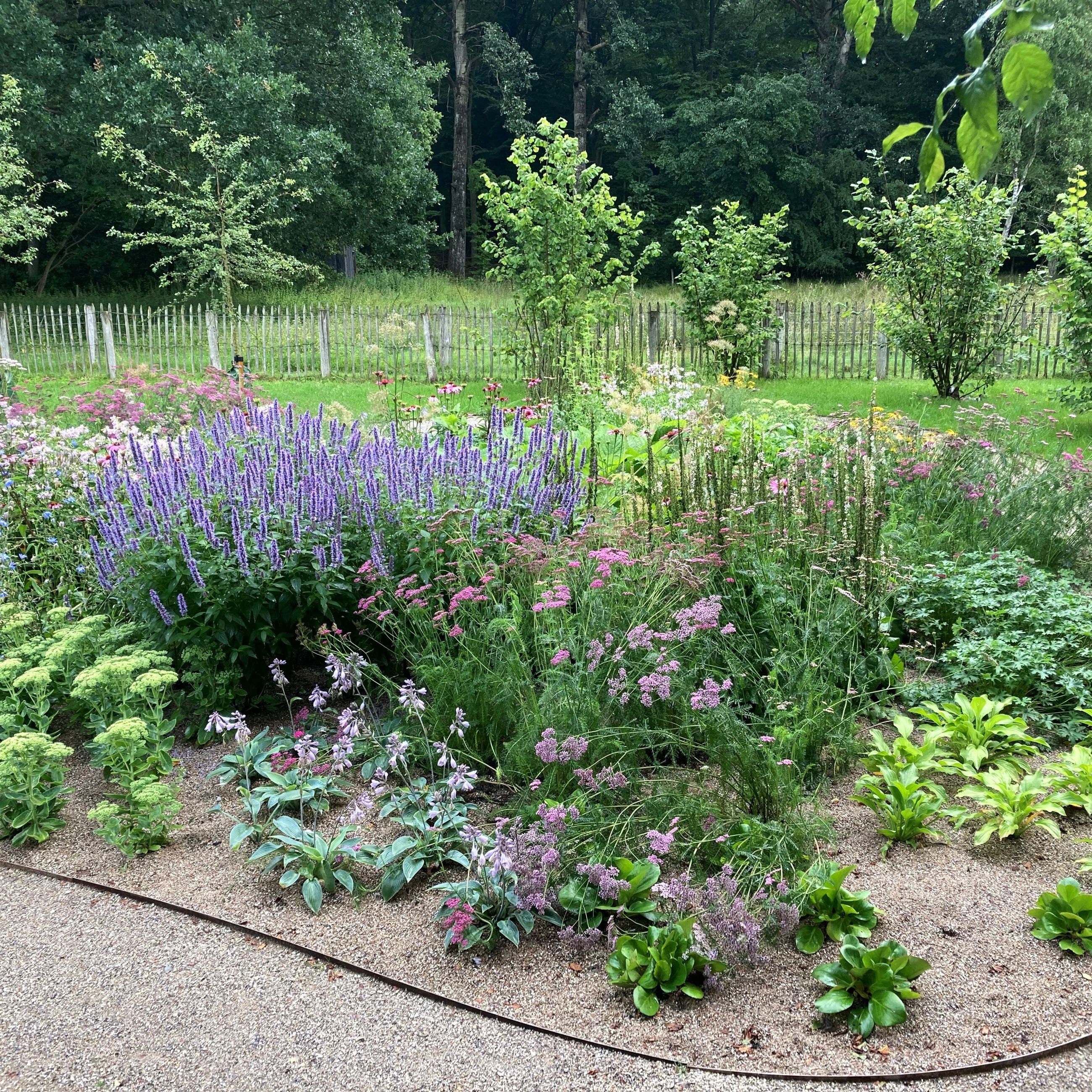 Skovhusets have er renoveret med stauder, græs, træer og en flot snoet sti.