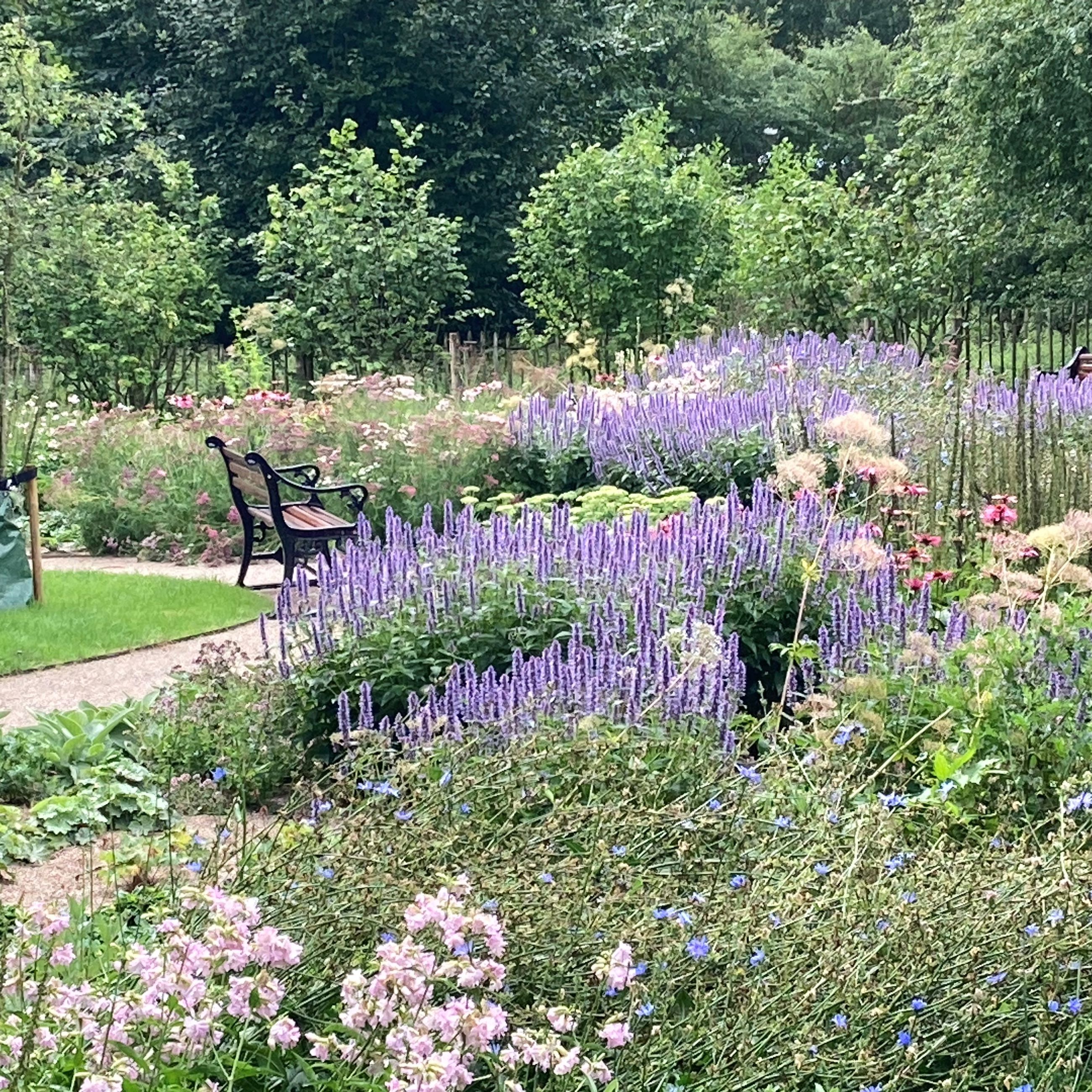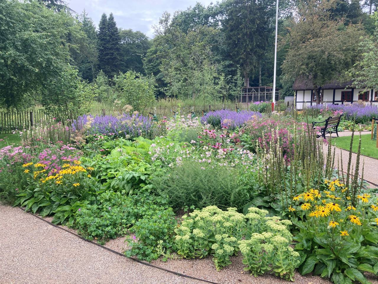 Haven viser harmoni og ro og indbyder en til at sidde på de smukke bænke og nyde området.