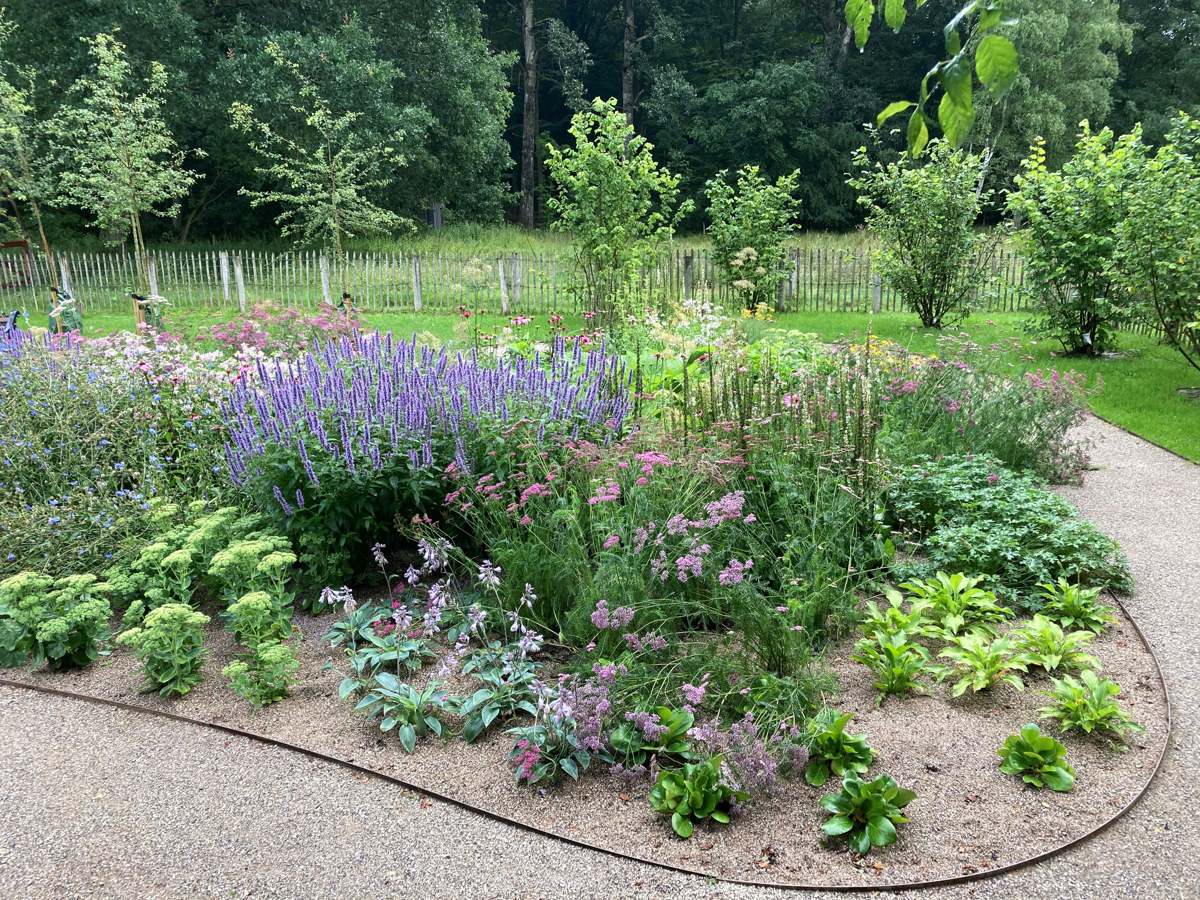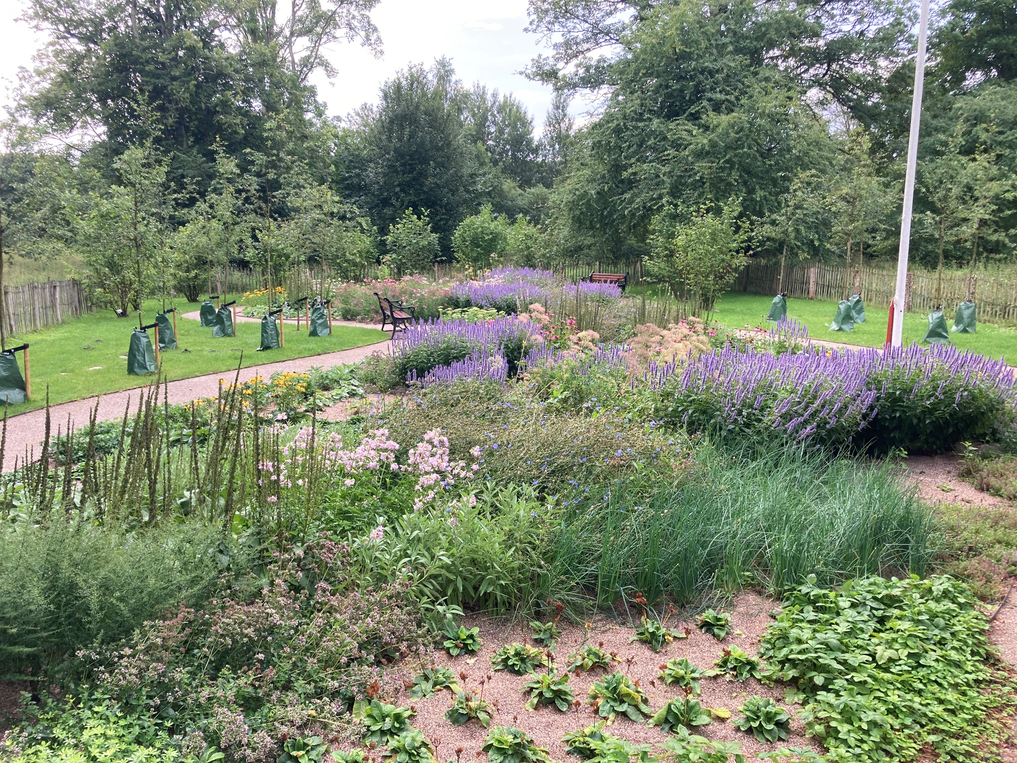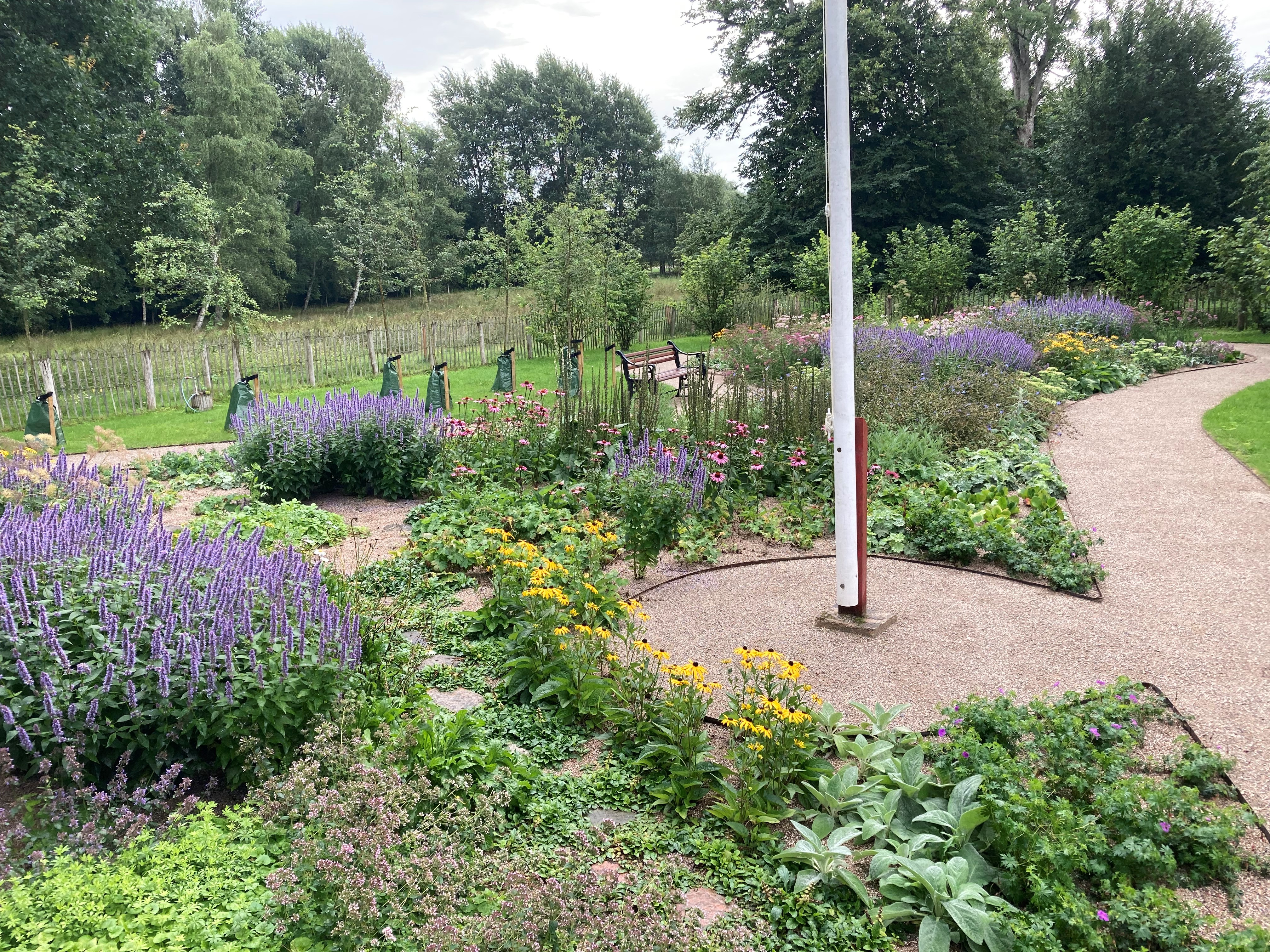 Skovhusets have er renoveret med stauder, græs, træer og en flot snoet sti.