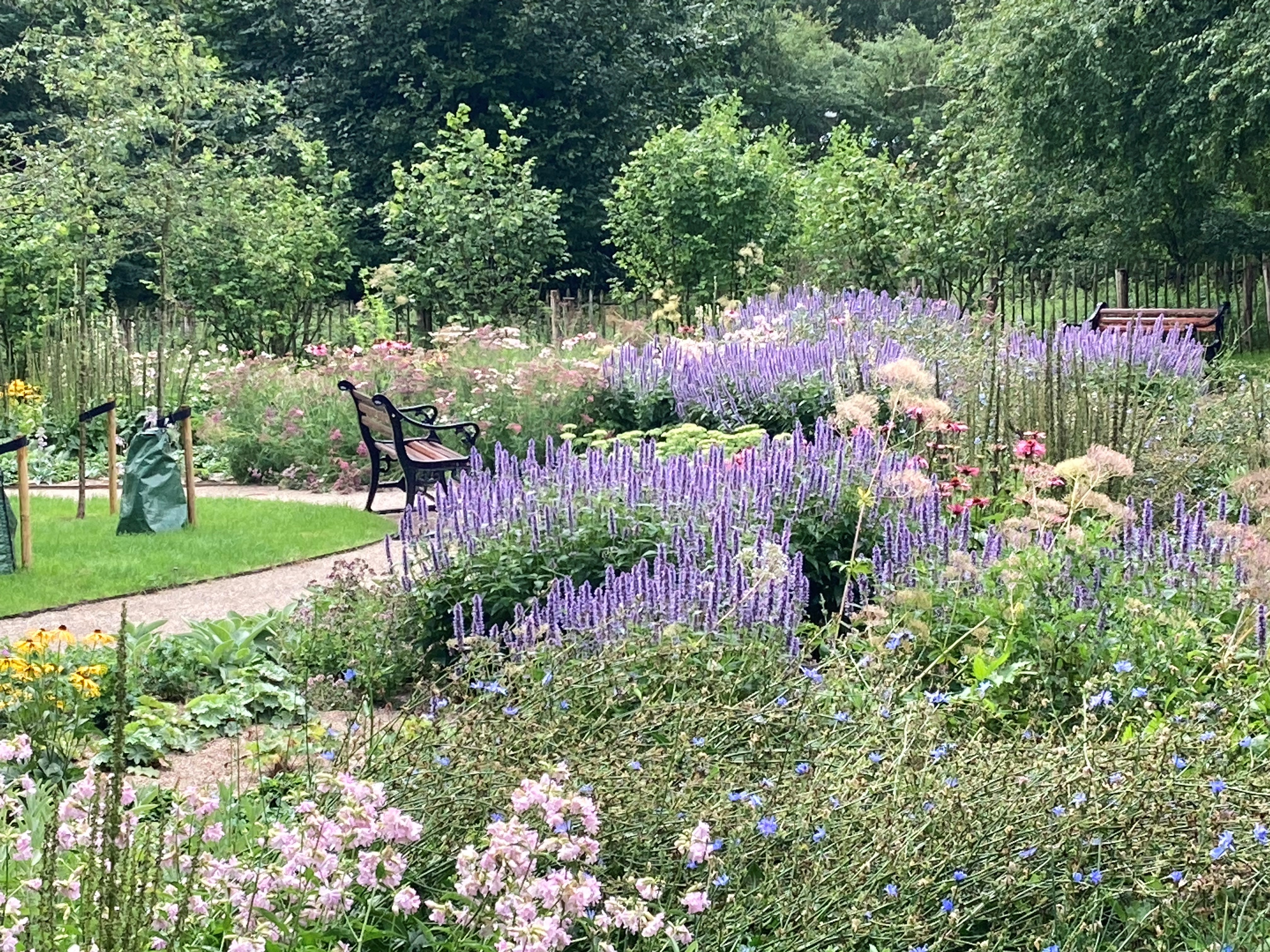 Haven viser harmoni og ro og indbyder en til at sidde på de smukke bænke og nyde området.
