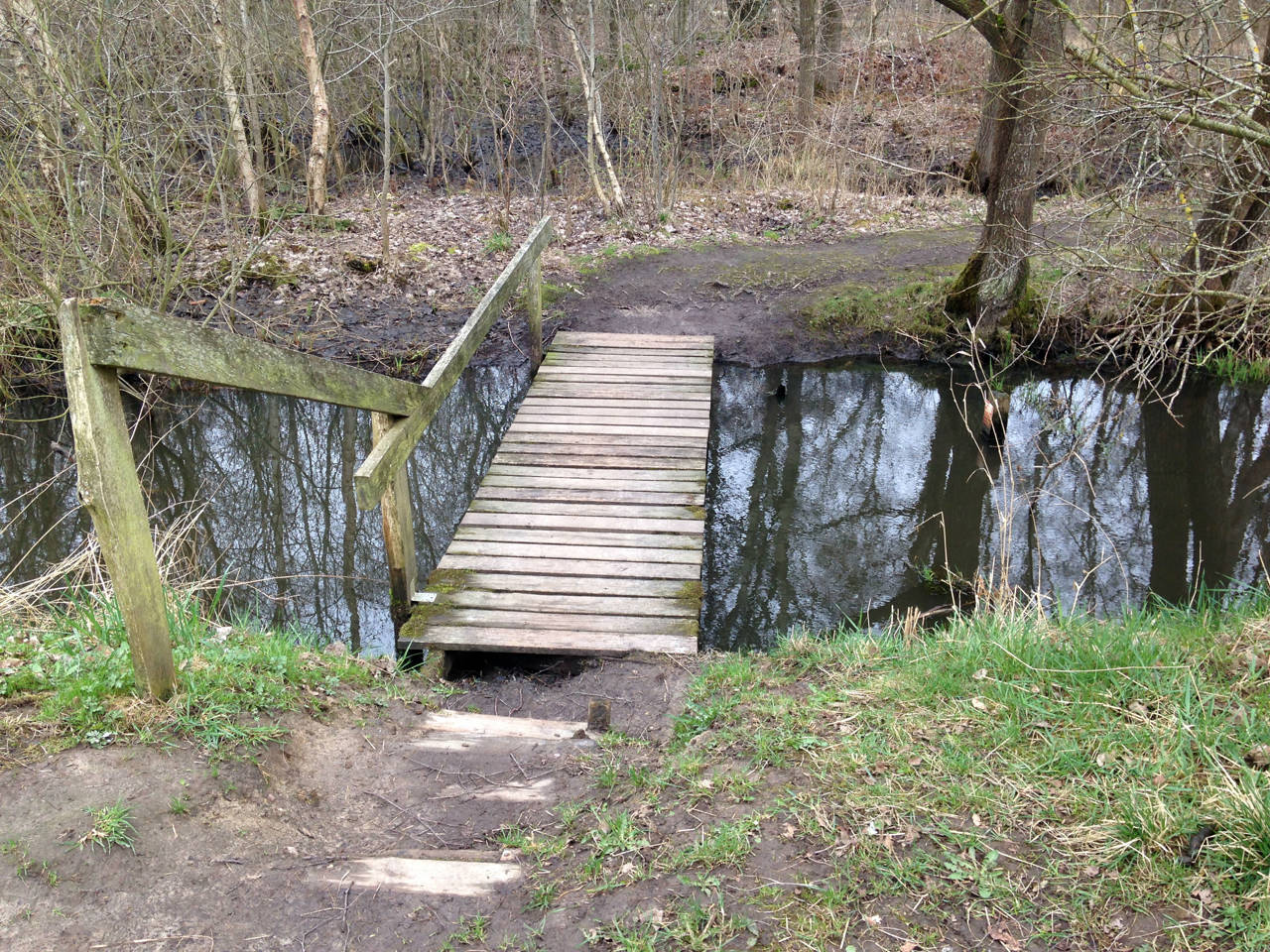 Et sving over en bro og ind i skovmosen. Birketræer og brun højmosebund på skovstien. Og små, dybe tørvegrave der ligger som perler på en snor langs stien.