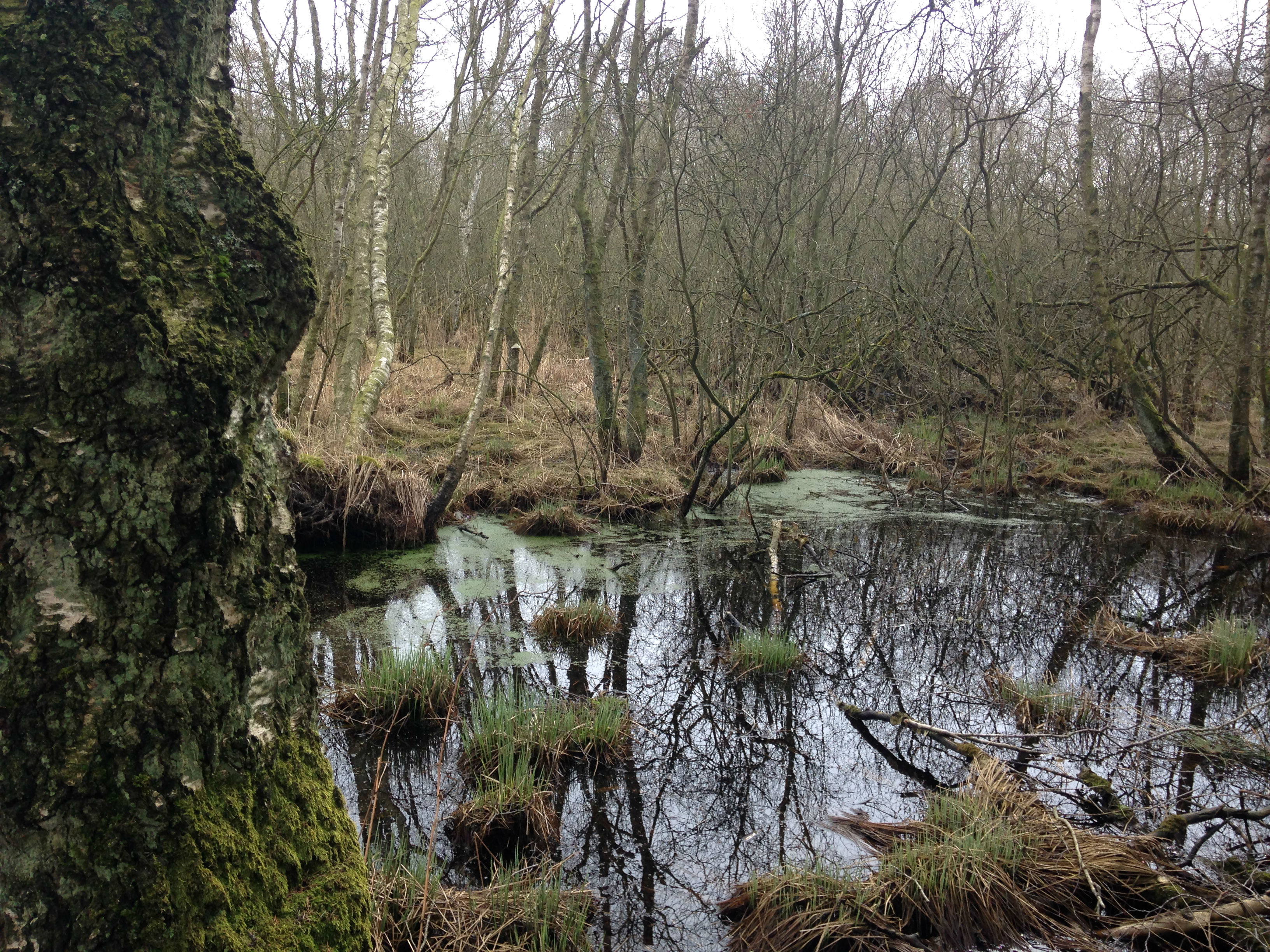 Et sving over en bro og ind i skovmosen. Birketræer og brun højmosebund på skovstien. Og små, dybe tørvegrave der ligger som perler på en snor langs stien.