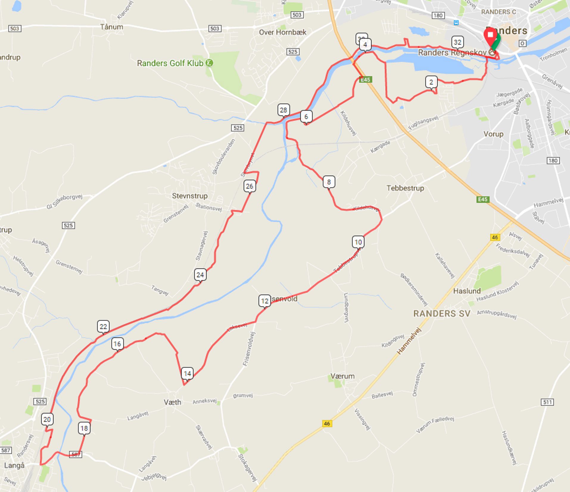 Startkoordinater i Google Maps: 56.455042, 10.039105 eller 56.458464, 10.020881