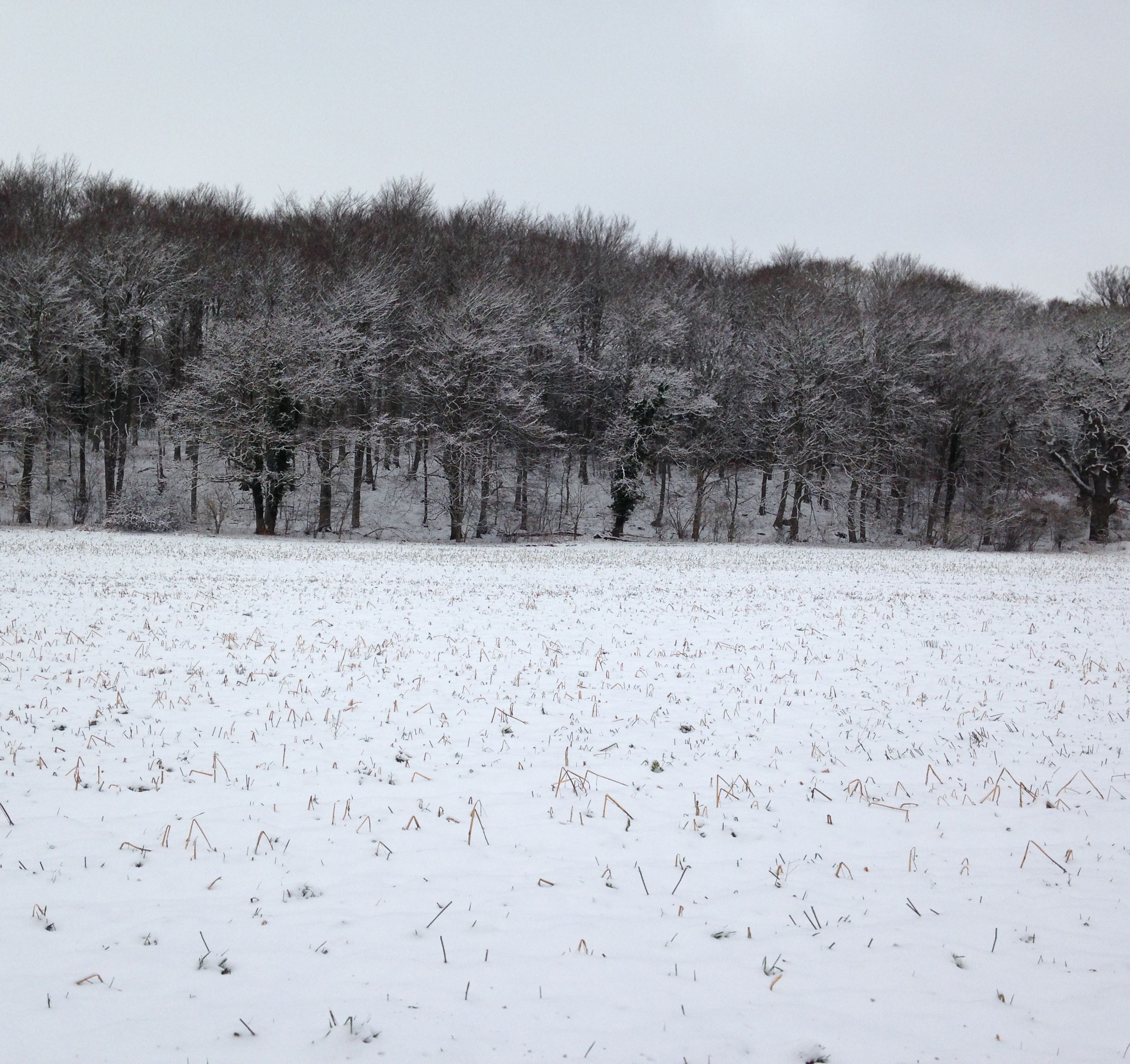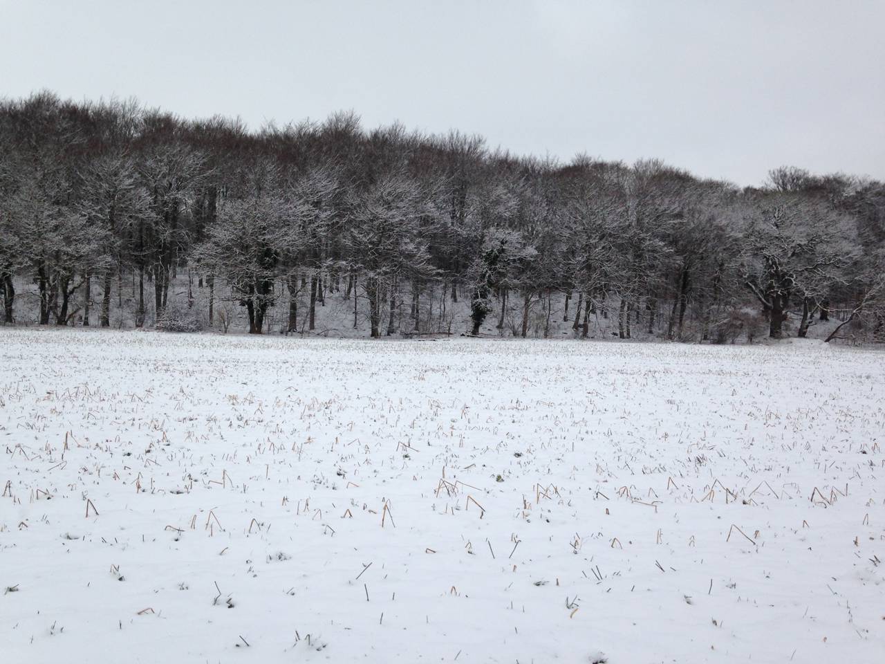 Der ligger stadig lidt sne på de små skovveje, og flere dyr har krydset spor i dagens eller nattens løb. En ræv og et dådyr, og friske fuglespor er der også. Jeg når kun at følge sporene et par meter, før en fasanhøne larmende letter fra skovbunden.