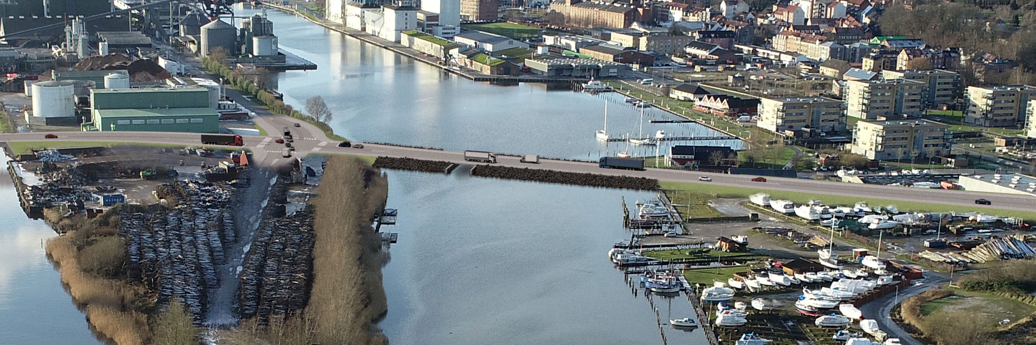 Dæmningen over det nordlige havnebassin bliver 160 meter lang. I dæmningen indbygges en sluse, der i størstedelen af tiden vil være åben for kano- og kajaksejlere og mindre fartøjer. I tilfælde af højvande kan slusen lukkes, så byen beskyttes. Regnvand fra byen løber ud i havnebassinet. Når vandstanden i fjorden er faldet, åbnes slusen og regnvand kan løbe ud i fjorden.